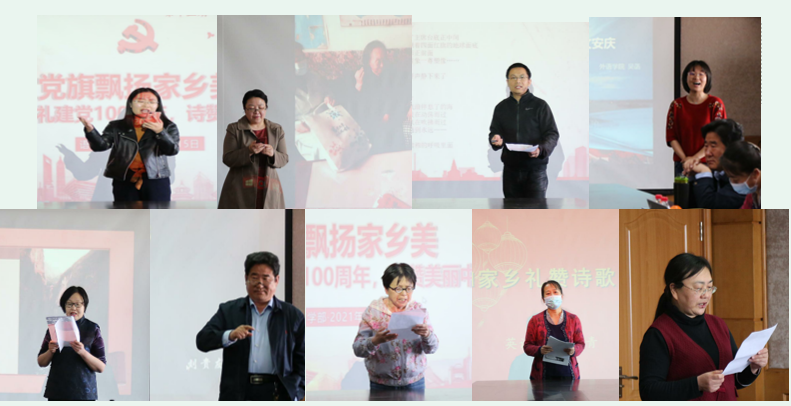 诗歌沙龙自宣传之日起立刻得到三个学院老师们的热烈响应,老师们积极报送作品,最终由三个学院各推选三个作品,在朗诵会上逐一精彩呈现。中文学院赵静老师朗诵的《祖国啊,我亲爱的祖国》在一幅幅流动凝重的画面和舒缓深沉的节奏中展现了中国让人振奋的崛起和新生;百合小说 熊莉萍老师用老革命的原创诗歌诉说了青春之路如何走过,何为集体与自我;中文学院黄海飞老师朗诵的《时间开始了》歌颂了伟大的时代;外语学院吴菡老师的《题天柱山》、吴飒老师的《战斗在太行山上》、刘贵友老师的原创诗歌《花都凌源》描绘了家乡美,抒发了浓浓的爱乡情;中文学院杨立群老师的朗诵作品《我爱这土地》、百合小说 蒿青老师的原创长诗《致家乡、致中国共产党》和百合小说 时晓英老师的《我爱你中国》则将对故土、对祖国、对党的情感推向高潮。