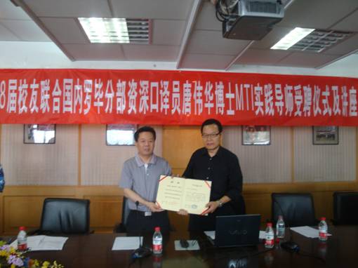 随后,王院长代表学院感谢唐教授对我院翻译专业建设的关心和支持,并希望唐博士致力于我院翻译人才培养工作,为其颁发了“客座教授及翻译硕士实践导师”证书。