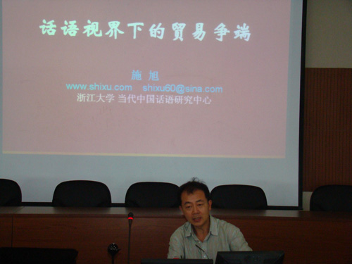 施教授首先指出,外贸争端不仅仅是经贸、技术、或法律问题,而是更广阔的多元因素交叉的话语现象。他从话语文化学的新视角,提出外贸争端研究的新理论、新视角,力争发掘我国外贸争端的话语经验和教训。他结合2005-2010年中国和欧盟鞋类出口的“反倾销”纠纷,提出从整体和辩证的视角研究语言使用。具体来讲话语分析应包含以下六个因素:1)说听主体;2)内容/形式;3)传播媒介;4)目的/原因/后果;5)历史关系;6)文化关系。在鞋类纠纷贸易冲突中,说听主体主要为各级政府和行会,而较少出现企业的声音;在内容和形式方面,外贸争端不仅仅是经贸、技术、或法律问题,而是更广阔的多元因素交叉的话语现象。在传播媒介方面,中国没有直接对应于欧盟的公开的正式文件。作为具有主体性质的媒体主要是中文的,外文的媒体形式相对少见。从历史的角度看,持续被动消极,法律行动过晚。而从文化的说听主体:中国只有极少数企业抗辩,商务部相对处于二线,总体是被动的;而欧盟的企业直接推动欧盟政府,政府遂采取相应的法律行动,总体是主动的。中国的话语缺乏有效性和权威性,而欧盟的话语更具有效性和权威性。