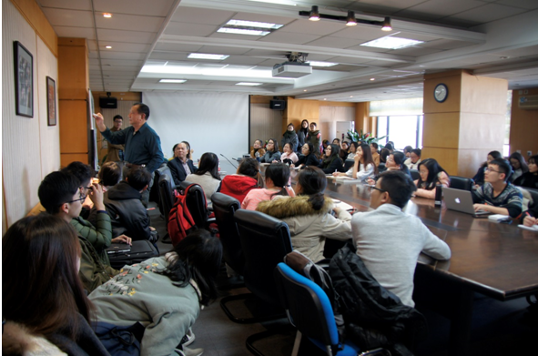 萧老师的讲座由“翻译的三个基本问题”引入,通过生动形象的案例和板书向同学们传达了自己多年经验积累出的“翻译之道”。他重点强调了翻译中汉语和英语的区别,认为英语讲究形式逻辑,注重形合,而汉语注重意合。要掌握好两种语言,前提是要明白两者的本质区别。想成为好的翻译,必须汉英齐头并进,只注重英语做不了好的翻译。