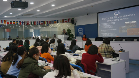 MTI学员举办了一场题为“Interpreting for the EU”的讲座。中心副主任胡荣老师担任现场主持,中心二年级的同学担任了现场同传的工作。