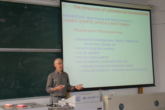 Chilton教授在讲座中首先从英语电话购物的一段录音语料谈起,分析买卖双方的语言以及语言背后的心理活动。Chilton教授介绍了商务买卖交易语言的分析工具:Cognitive Frames (Schemas), 并从Commercial Transaction Frame and Speech Event Frames两方面进行阐述。在Speech Event Frames中,Chilton教授重点介绍了“面子”理论中的面子威胁行为(Face-Threatening Acts)的语言策略, 并把这一策略运用到真实英语电话购物的话语分析中,使理论与商务话语分析密切结合,使与会者领悟了话语分析理论的魅力。讲座引起了与会师生的极大兴趣,在互动环节和讲座结束后,教师和学生们纷纷提出问题与Chilton教授交流,气氛热烈。