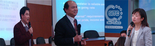 俞利军教授首先以“专业译员的培养”为题,分析了译员的角色定位和口笔译所要求的各种素养和能力,他重点介绍了国际和国内职业译员的培训机构和培训方法。在一个多小时的讲座中,俞利军旁征博引、密切结合实际,讲座内容充实,语言生动幽默,让大家对口笔译行业和素质要求有了更深入的了解,激发了听众学好口笔译服务于国家和社会高端翻译市场的热情。