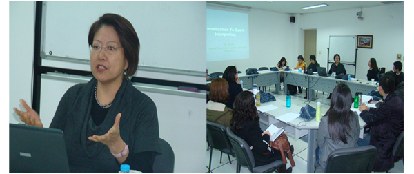 4月16日下午,博学楼711同声传译模拟教室, 美国资深法庭口译专家、前夏威夷口译笔译协会会长刘欣博士受邀来我院作题为《美国法庭口译》的学术讲座,吸引了不同专业、甚至不同学院、不同学校的同学。中欧译员培训中心陈延军老师担任主持。刘欣博士从法庭口译的历史、庭审程序及礼节、口译员的职责与准则、口译中的问题及处理方法等方面进行了详尽的介绍,与同学们进行视译、交传的互动练习,并就大家感兴趣的话题作了深入探讨。她的讲座内容广泛、语言幽默,既结合理论又联系实际,彰显大家风范。高质量、精彩的讲座引起了大家的热烈反响。
