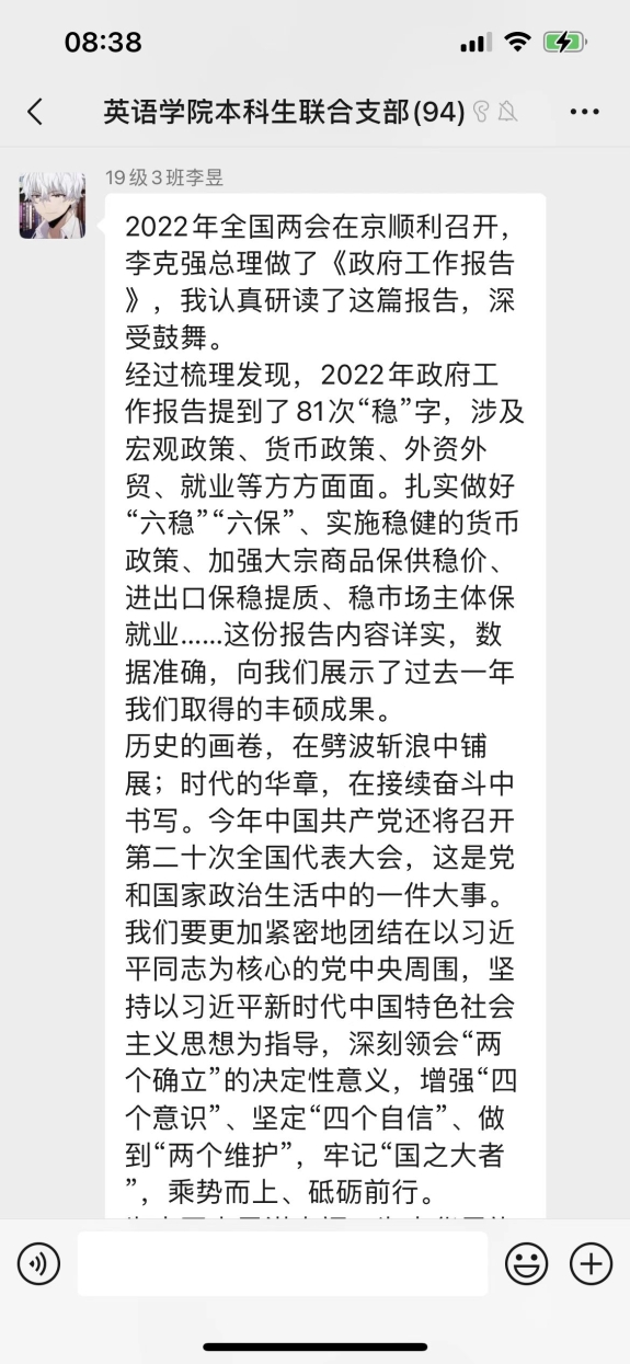 伴随着浓浓春意,2022年全国两会拉开帷幕。今年是进入全面建设社主义现代化国家,向第二个百年奋斗目标进军新征程的重要一年。按照学校党委和学院党委的部署,百合小说 本科生联合党支部组织全体学生党员、新一批发展对象、入党积极分子通过网络、电视等各种形式自主收听收看两会,热议政府工作报告,表达作为学生党员在新时代奋进新征程的决心。
