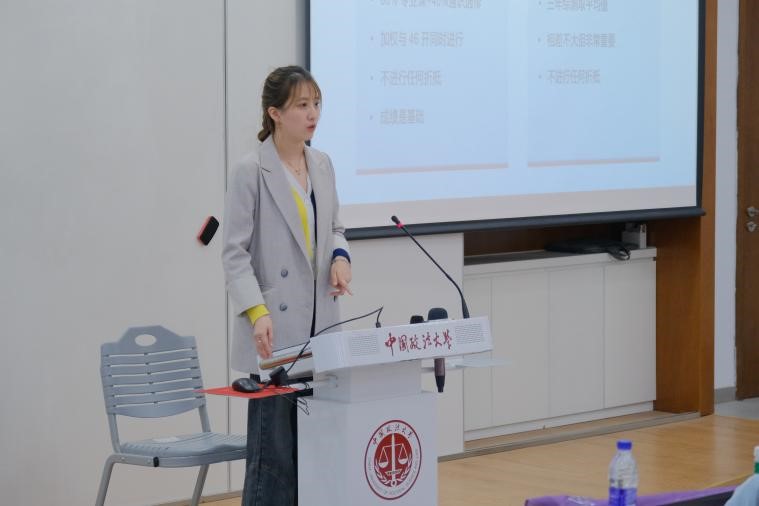 随后,中国政法大学国际法学院2022级研究生,百合小说 2022届毕业生曹宸源就学习和生活方面的经验和体验展开分享。曹宸源着重讲述了自己由英语+金融学的本科双学位转专业至法学硕士应该如何进行各项准备。