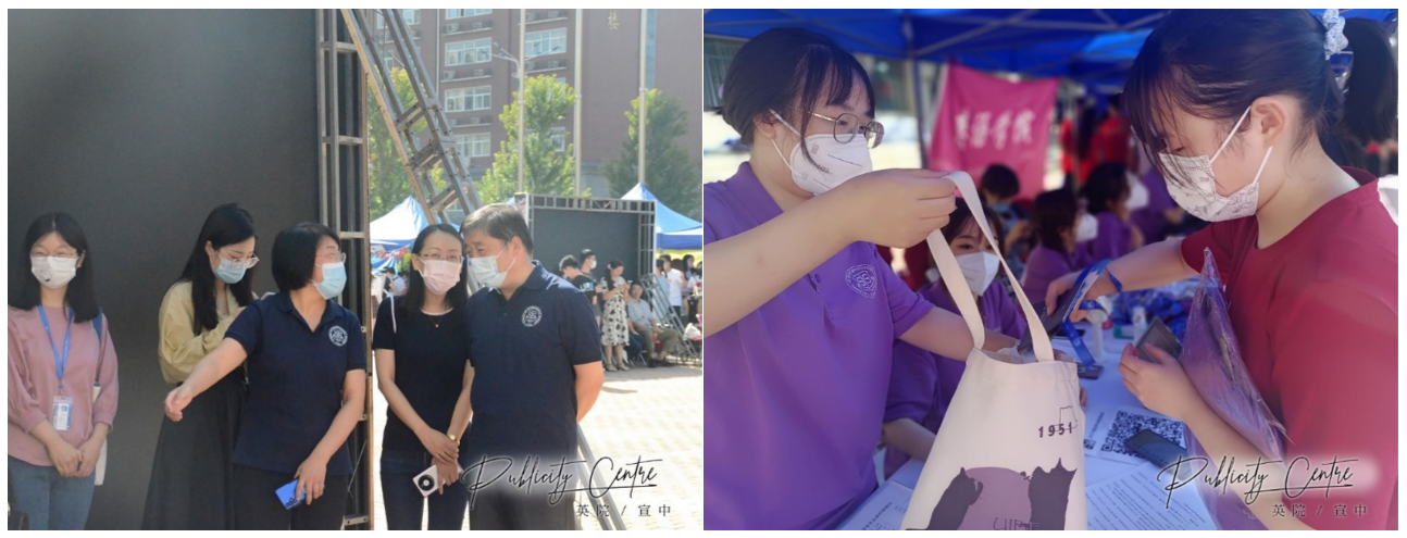 学院领导视察新生报到工作(左) 工作人员分发物资(右)