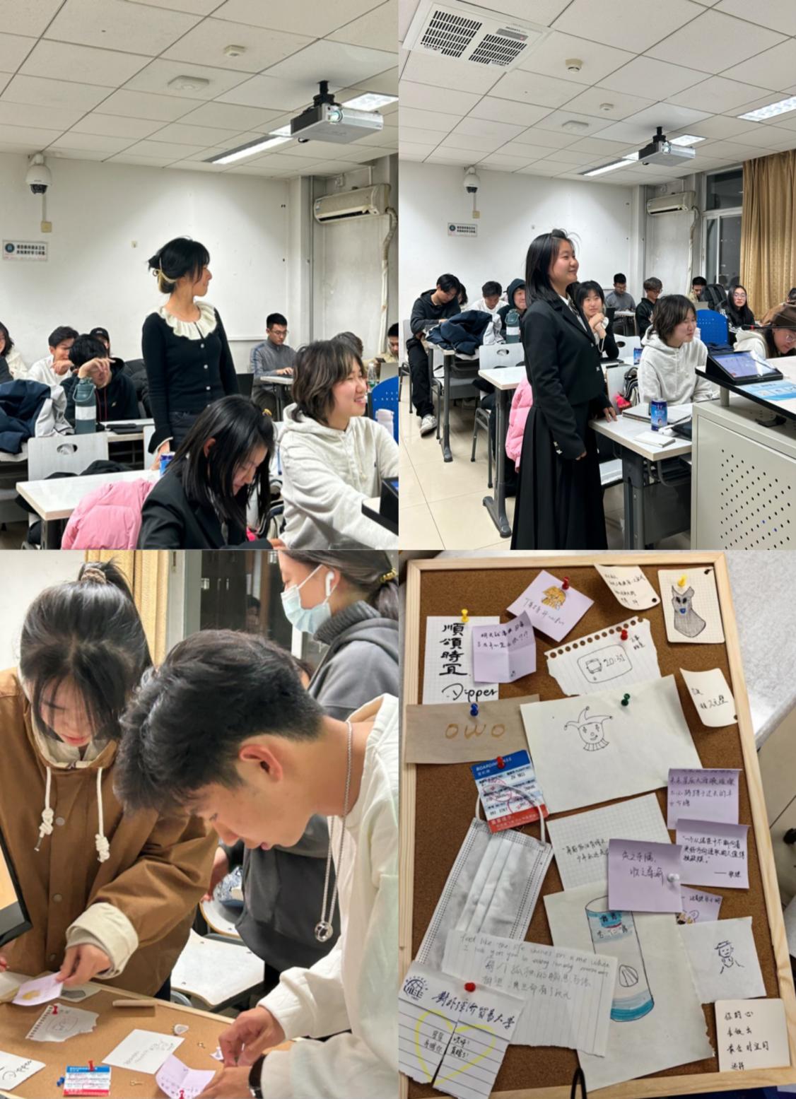 英语2302班则聚焦于拼贴画的共同创作。班长左涵文和团支书张欣共同带领大家创作拼贴画,利用创作宣泄心情减轻压力,同时提升班级凝聚力。同学们认真投入、积极参与。最终作品体现出了同学们对美的追求以及在生活中的点滴感受。创作完毕后,班助刘琛悉心为同学们解答了最近疑惑较多的选课问题,同学们受益匪浅。