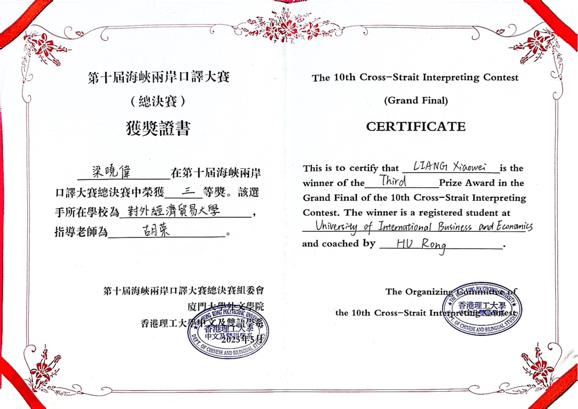 “海峡两岸口译大赛”是由厦门大学发起并主办、海峡两岸高校广泛参与、在海峡两岸暨港澳地区高等教育领域具有重要影响力的国家级品牌学业竞赛。自2009年首届大赛成功举办以来,大赛已连续举办了10届,参赛院校超过2000校/次,涵盖了大陆70%以上的双一流建设高校,以及台湾、香港、澳门所有开设翻译学科的高校。2011年,“海峡两岸口译大赛”被列为国台办对台交流重点项目规划,2014年被列为教育部对台教育交流重点项目,是国家级品牌赛事。2024年11月8日,在香港中文大学(深圳)举办的“第十届海峡两岸口译大赛大陆决赛”中,梁晓伟荣获大陆决赛一等奖。