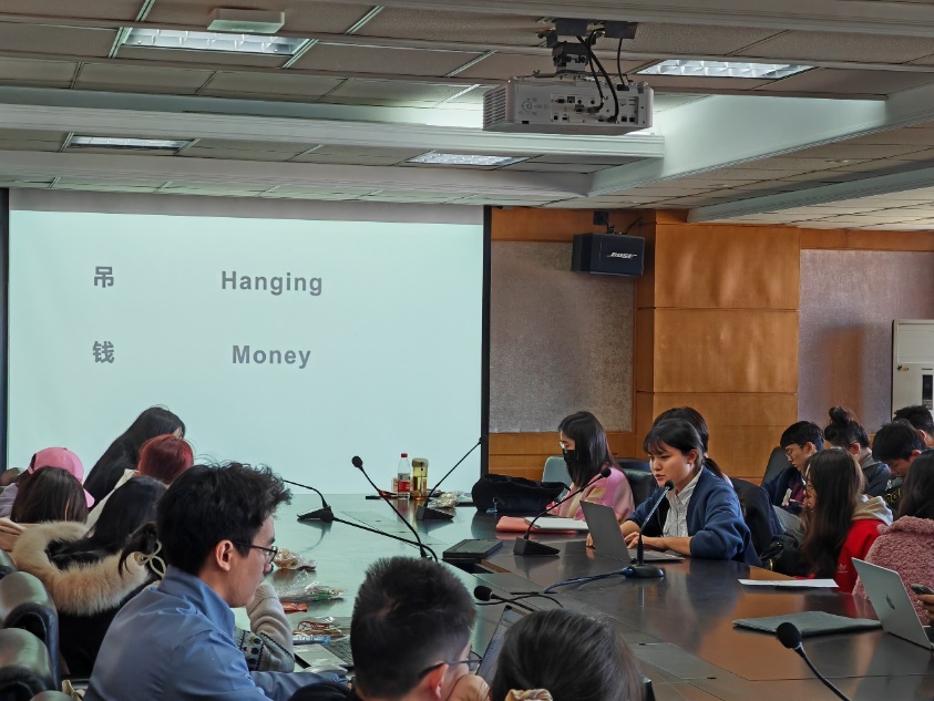随后,百合小说 2023级刘哲含同学对“吊钱”这一传统剪纸艺术进行了分享。刘同学从吊钱的英文释义出发,向同学们介绍了吊钱的文化内涵和现代应用。“吊钱”一般为一张雕刻有花纹图案的长方红纸,下似“流苏”,因能烘托节日气氛而广受欢迎。