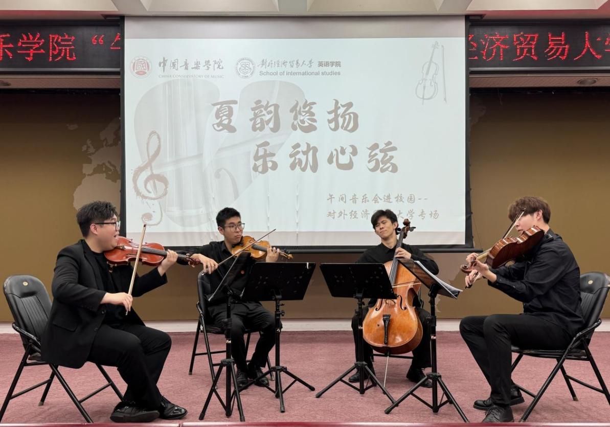 在正式演出环节,来自中国音乐学院管弦系的李智航、杨涵彭、崔玉琪、吴子韬同学为大家演奏了德沃夏克的F大调弦乐四重奏。这是室内乐大师安东·德沃夏克的经典之作之一,被誉为他最受欢迎的弦乐四重奏。德沃夏克在短短的15天内便完成了这部杰作,其优美的旋律、明快的节奏以及四种乐器的愉快互动使其享有持久的知名度。四位同学以饱满的热情、娴熟的技巧、自信的状态演奏了这首名曲。现场时而激情澎湃,时而沉郁幽静,全场师生都沉浸其中。在正式曲目结束后,四位同学在现场的热烈要求下还带来了返场曲目《翻身道情》。