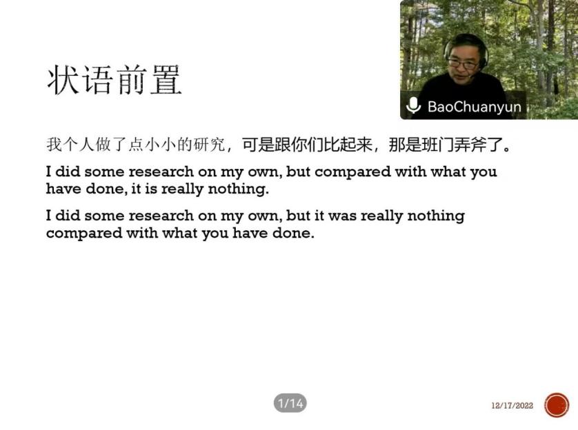 鲍教授以丰富详实的例子说明了中英语言在表态动词、句子主语和并列方面的差异。在表态动词方面,中文中的动词在英文中可能对应着介词连词结构;在英汉互译时,句子的主语也需要做出调整。例如,中译英时,直接选取中文的主语作为英文句子的主语往往显得表达不够地道,要想表达符合英文习惯,常常需选取动作执行者作为英文句子的主语;在翻译中文的并列结构时,更要注重分析句子间隐含的、内在逻辑关系,分清句子的主句和状语。