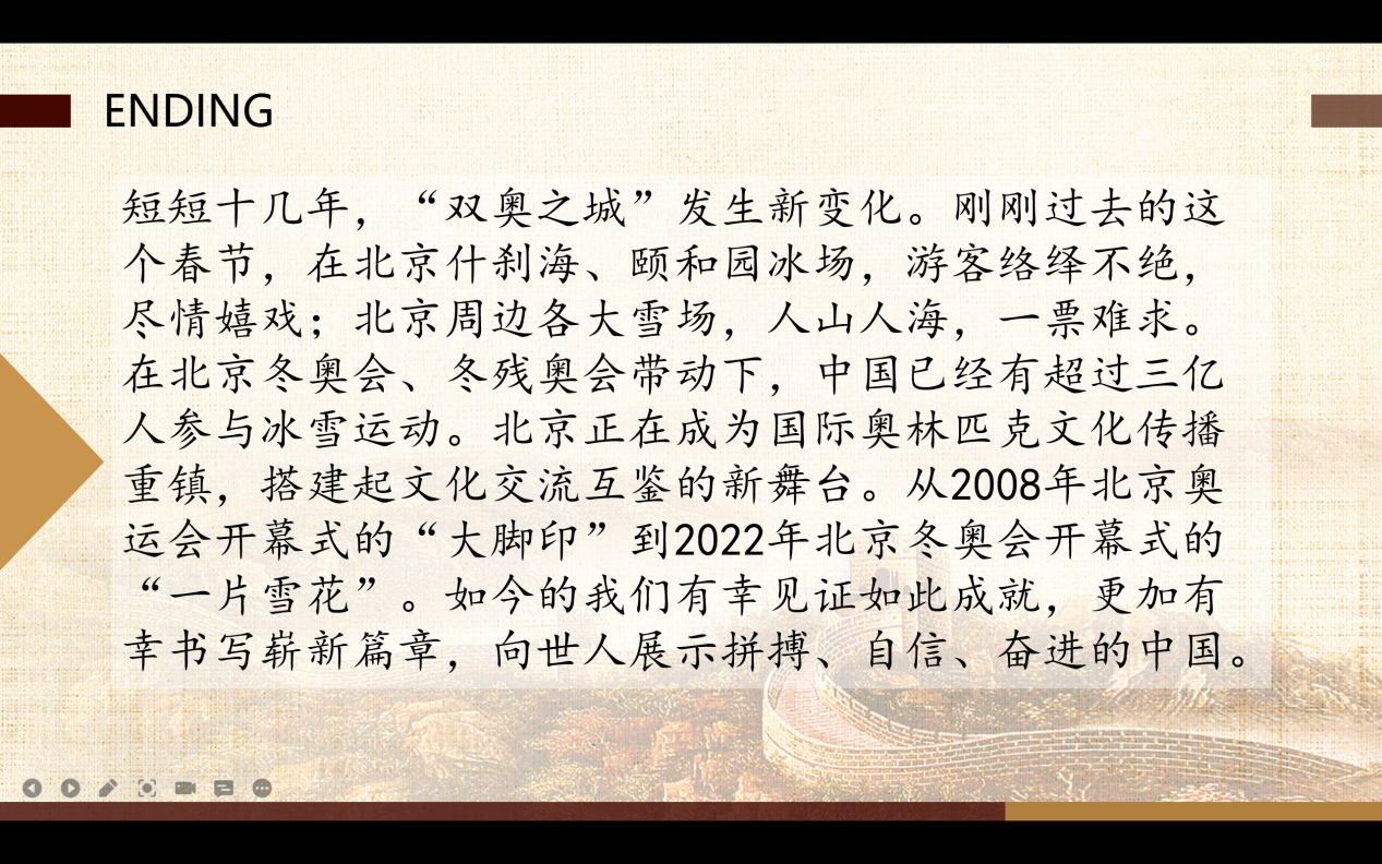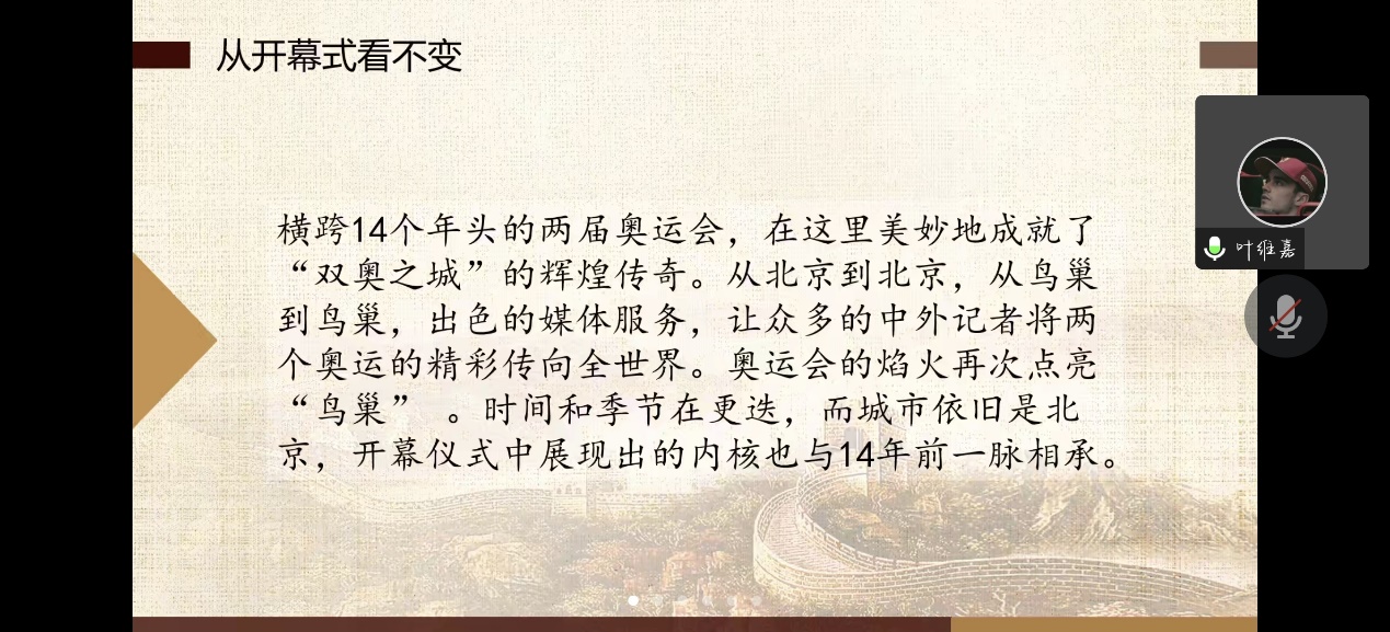 接着,活动进行到第二部分,叶维嘉同学分享了冬奥里的那些“变”与“不变”。14年过去,开幕式的内核不变,但我们向世界展示自己的姿态和方式在改变。在开幕前,北京冬奥组委开闭幕式工作部部长、国家体育场场馆主任常宇在采访中说道:“2008年中国人第一次办奥运会,大家迫切想让世界知道今天的中国是什么样,所以奥运会主要都是在讲述“我是谁”。现在十几年过去了,中国也发生了翻天覆地的变化。所以在这个时候,其实我们更想向世界讲述今天的中国人,怎么理解在这个世界上国与国的关系和人与人的关系。表达的出发点有很大不同。