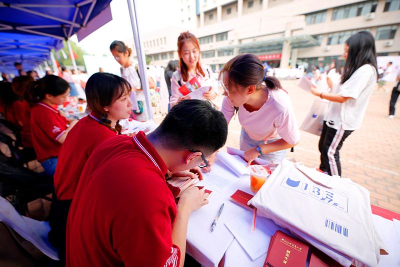随着新生陆续报到,迎新工作有条不紊的进行着。纵使天气炎热,工作人员依旧热情高涨,耐心引导新生按流程注册报到、领取新生资料袋,并热心解答他们的各种疑问。