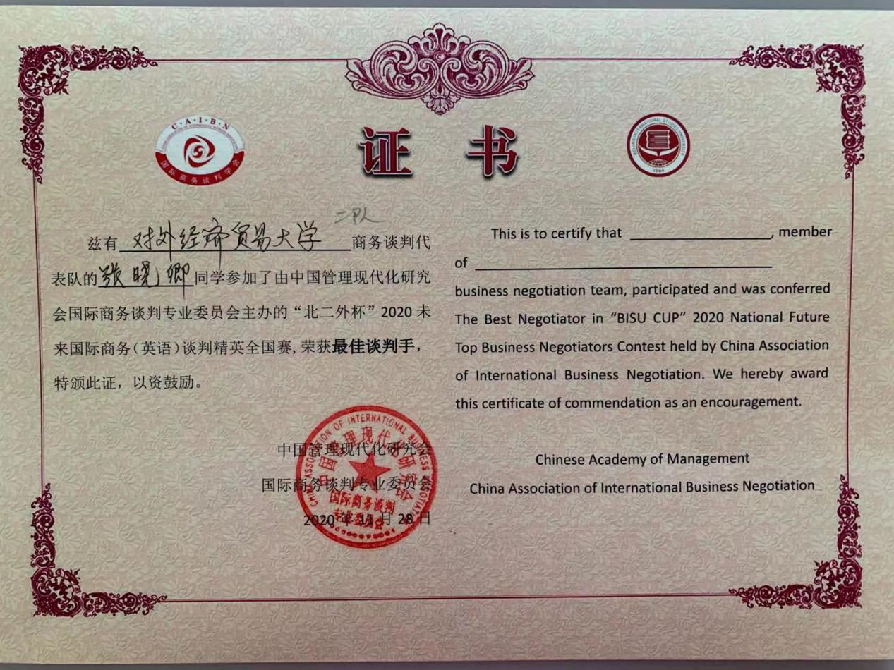 张晓卿同学获“最佳谈判手”称号