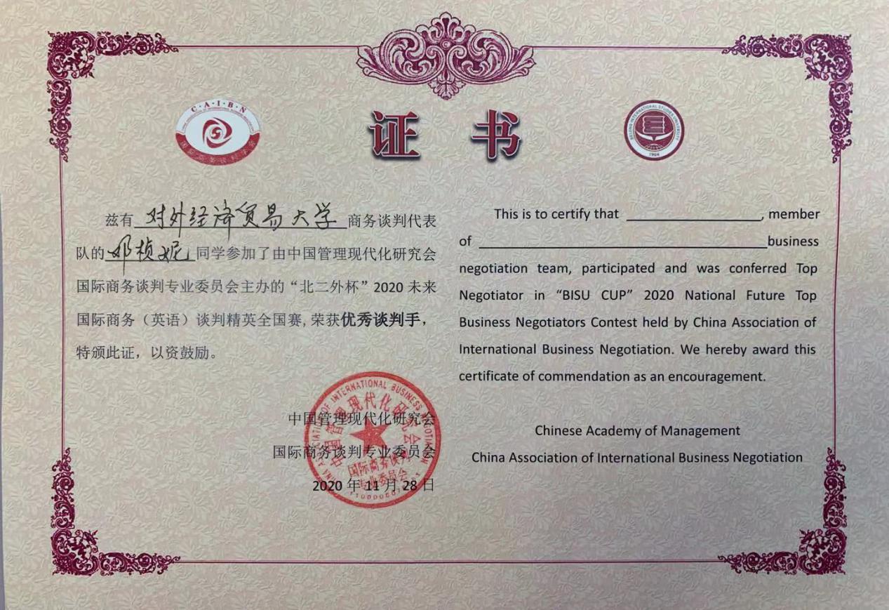 邓桢妮同学获“优秀谈判手”称号