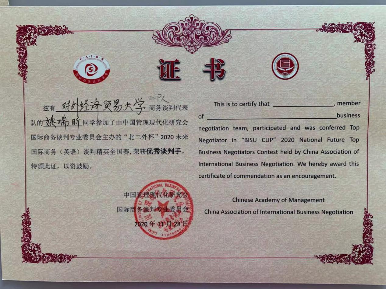 姚瑞昕同学获“优秀谈判手”称号