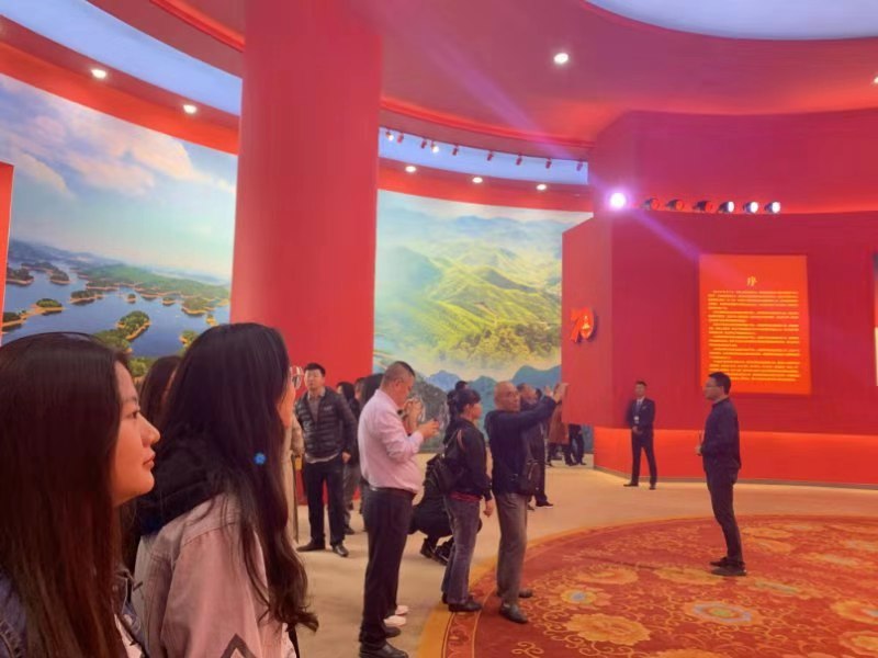 展览分为“序言”“屹立东方”“改革开放”“走向复兴”“人间正道”五个部分,带领大家回顾了1949年到2019年的新中国70年走过的光辉历程。同时,选择了150个“新中国第一”进行展示,全方位立体化呈现新中国成立70年来中国共产党领导中国人民发愤图强、艰苦奋斗的伟大跨越,深刻展现了新中国70年的巨变历程。大家认真聆听讲解,仔细观看历史图片、互动视频、模型场景等,对新中国成立70年来取得的辉煌成果有了更直观、全面的认识。