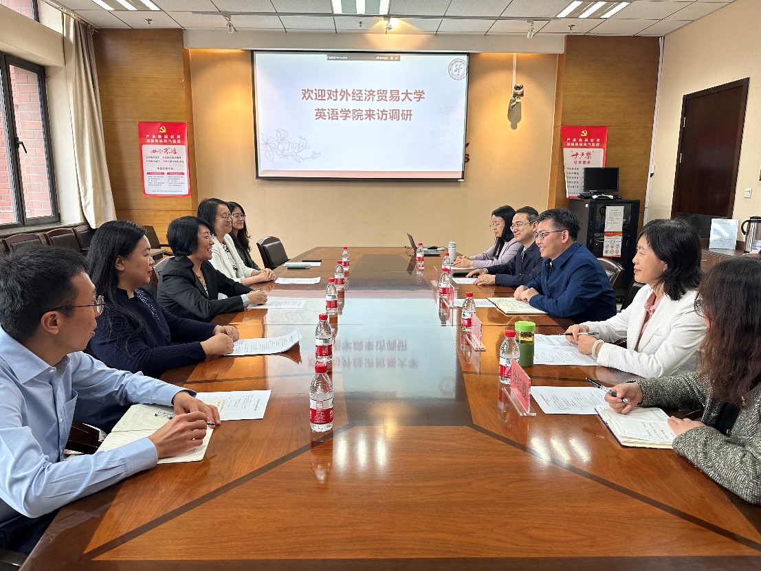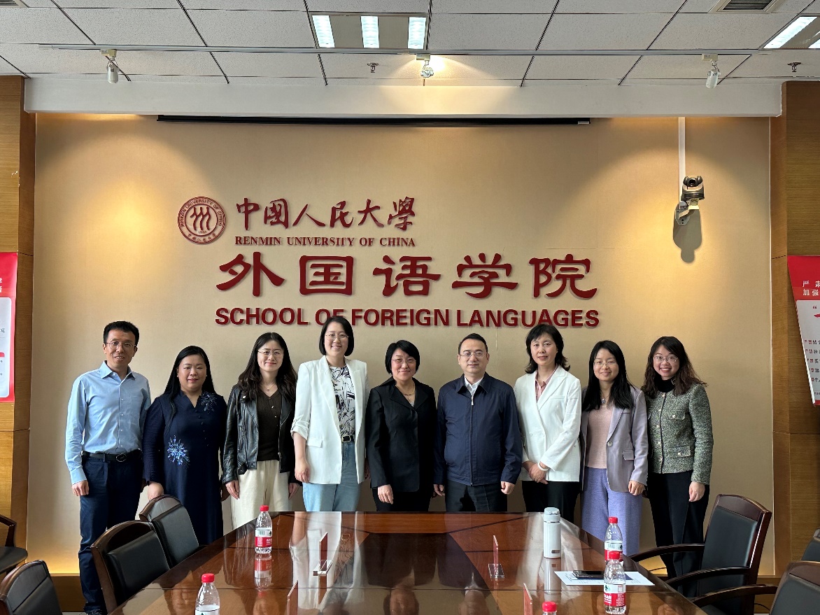 2024年4月19日上午,学院党委书记项洁、副院长赵丹彤、基础英语系主任李玉霞、专用英语系主任刘丽和教师任岳涛赴中国人民大学外国语学院开展调研交流活动。中国人民大学外国语学院党委书记李臻云、副院长王建华、大学英语教学部党支部书记张雅萍、大学英语教学部副主任陈艳红和副主任徐红霞参加座谈。