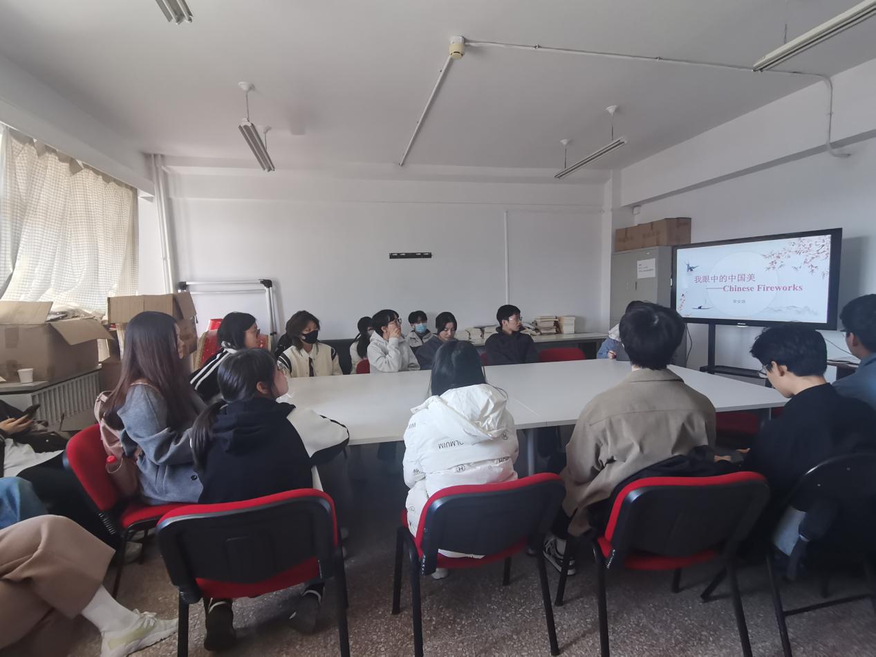 分享会开始时,荣安琪同学首先介绍了烟花的历史渊源、制作工艺以及在中国文化中的象征意义。她生动地描述了烟花在中国各个节日和庆典中的应用,让在场的同学们对烟花有了更深入的认识。
