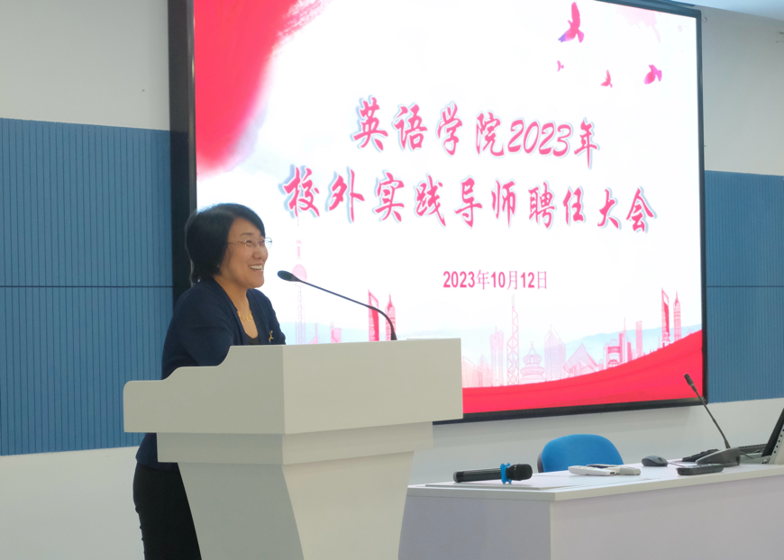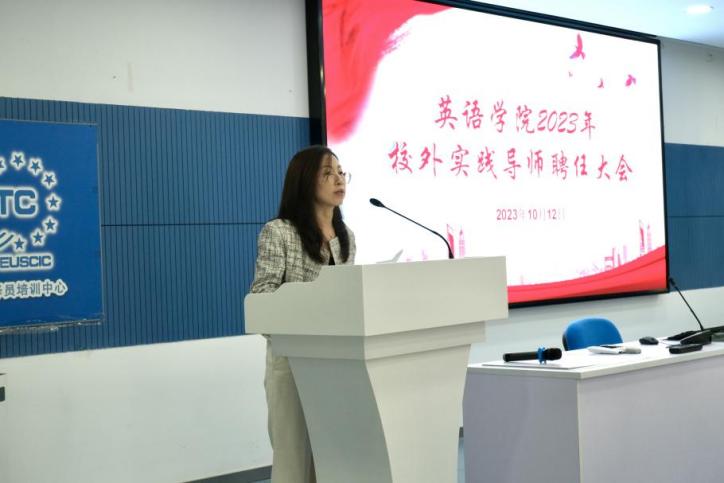 首先,项洁书记致辞。她说,对外经贸大学翻译专业硕士项目,致力于培养具有国际竞争力的高层次、复合型、应用型翻译专业人才。我们的实践导师来自于翻译、传媒、金融、贸易、司法等多个领域,有的是我们的优秀校友,有的是来自共建实践基地的专家,还有的曾经或者正在政府部门、国际组织、行业协会工作,都是在各自领域有着丰富实践经验、丰硕实践成果和重要影响力的专家。他们热心教育事业,无偿投入智慧和精力,与我们教师一起悉心培育翻译专业人才,为翻译专业硕士点建设做出了重要贡献。她对续聘的实践导师们的长期支持表示诚挚感谢,对新聘导师表示热烈欢迎。她鼓励同学们向导师们学习,苦练内功、多多实践,努力成为能够为中国高质量发展和高水平对外开放做出突出贡献的高级翻译人才。