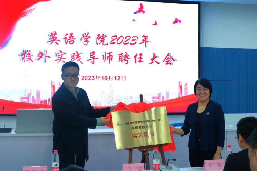随后,项洁书记与中国日报网人力资源部总监邢熙翔先生共同为MTI校外实践基地揭牌。中国日报网是中国日报社旗下企业,本次实践基地的揭牌为学院研究生进行多领域、多方向实践提供了又一坚实的保障。
