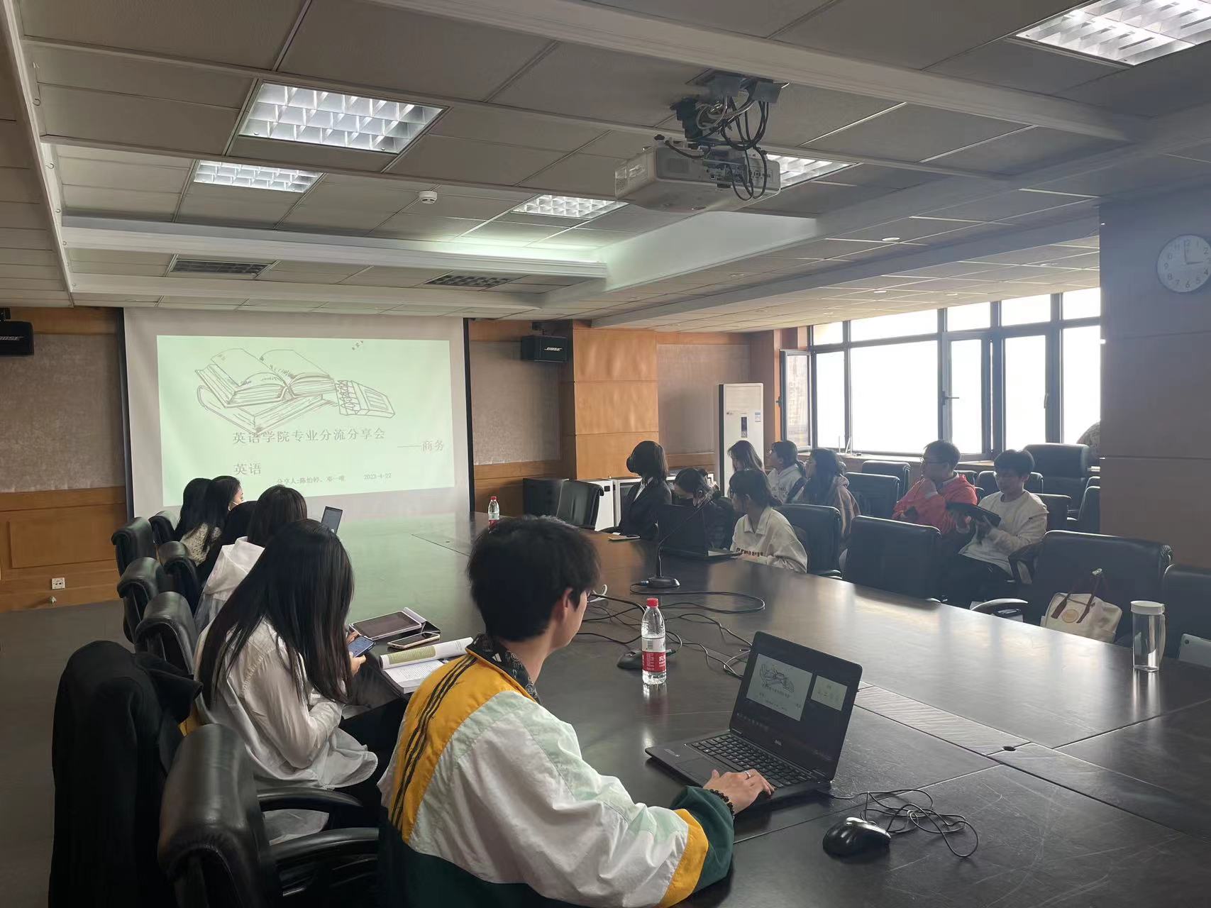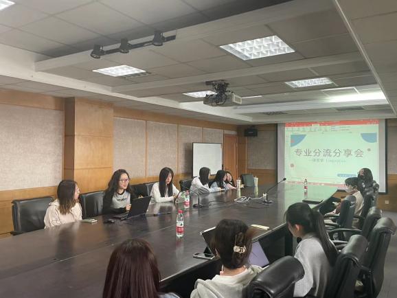 4月27日下午,百合小说 本科生联合党支部的九名党员在诚信楼1314举办“学生党员微课”分享会,向即将面临专业分流选择的2022级学生介绍了商务英语、翻译、国际传播、语言学、文学五个不同专业方向的相关情况。