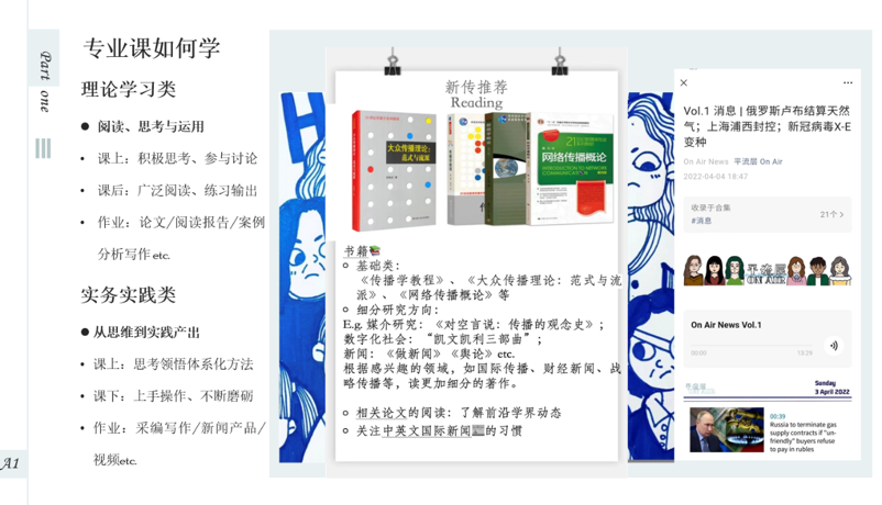 在课程设置方面,马新鑫同学结合更新的培养方案,向同学们详细介绍专业主修课程。武佳颖同学将课程分为理论学习和实践导向的类别,分别与大家分享如何学好这些专业课的思考,推荐阅读书单并鼓励大家多多将学习和社会时事联系起来进行表达与思考。