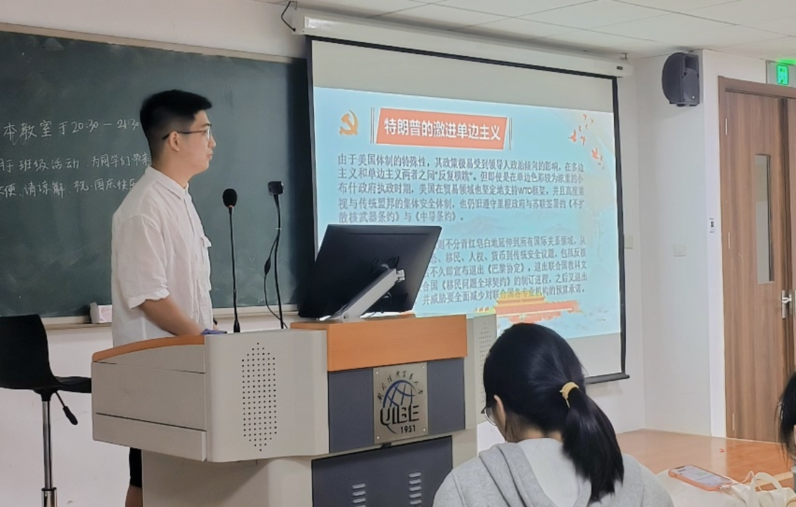 三位党员分享结束后,英语2203班班长欧念静同学分享了对本次“全球化”主题班会的理解。她认为,在疫情、战争等世界背景下,全球化的发展让新时代青年充分认识到中国在全球化过程中的积极表现与作为。