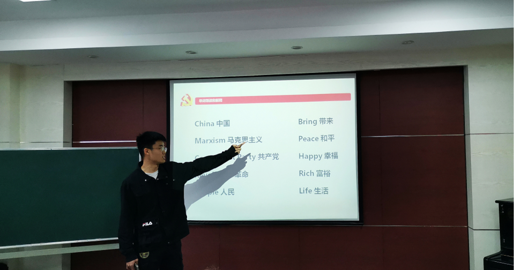 英文话党史部分,张嘉桐同学讲解了与中国共产党相关的英语词汇,并带领大家一起朗读,各位入党积极分子也帮助阿姨们学习发音,并解答她们的疑惑。最后,以一首慷慨激昂的党诗为此次活动划上了圆满的句号。