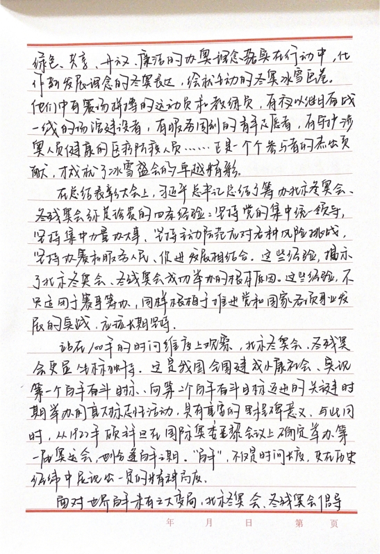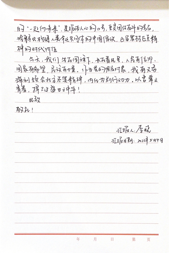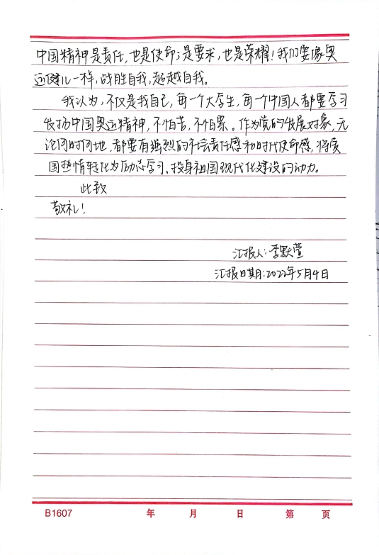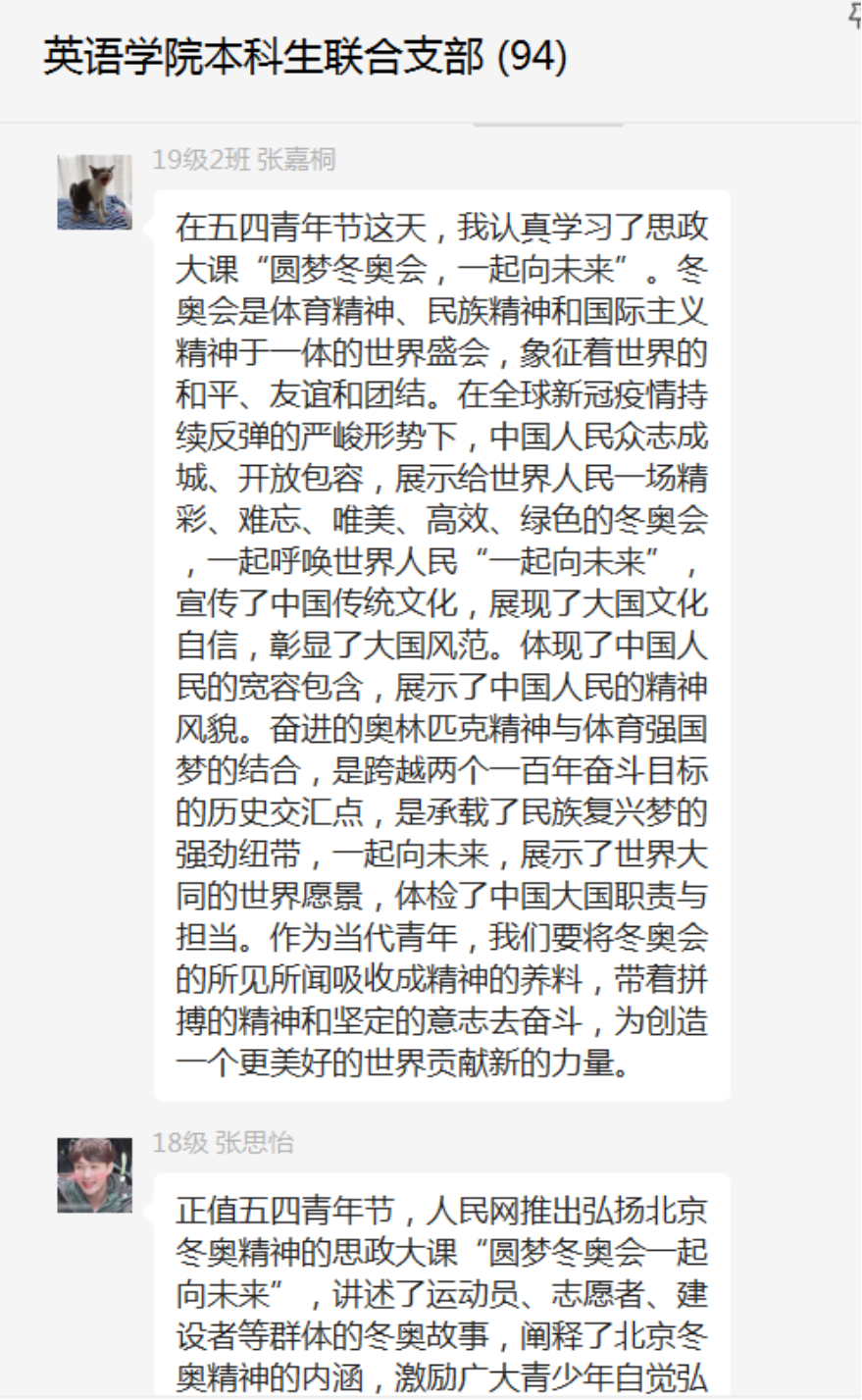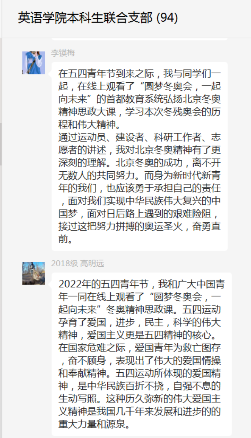 2019级党员姚可譞谈到,5月4日这天,我认真观看和学习了“圆梦冬奥会,一起向未来”线上思政大课,这堂课让我真正明白了青年应该发挥的作用。当代青年要主动传承弘扬“胸怀大局、自信开放、迎难而上、追求卓越、共创未来”的北京冬奥精神,刻苦学习、锐意进取、不负韶华、不负时代,争做堪当民族复兴重任的时代新人。只有弘扬北京冬奥精神,传承冬奥遗产,以更加坚定的自信、更加坚决的勇气,逐梦前行、砥砺奋进,才能在时间的长河中定义新的时间,在历史的变迁中创造新的历史,共享新的时代荣光!